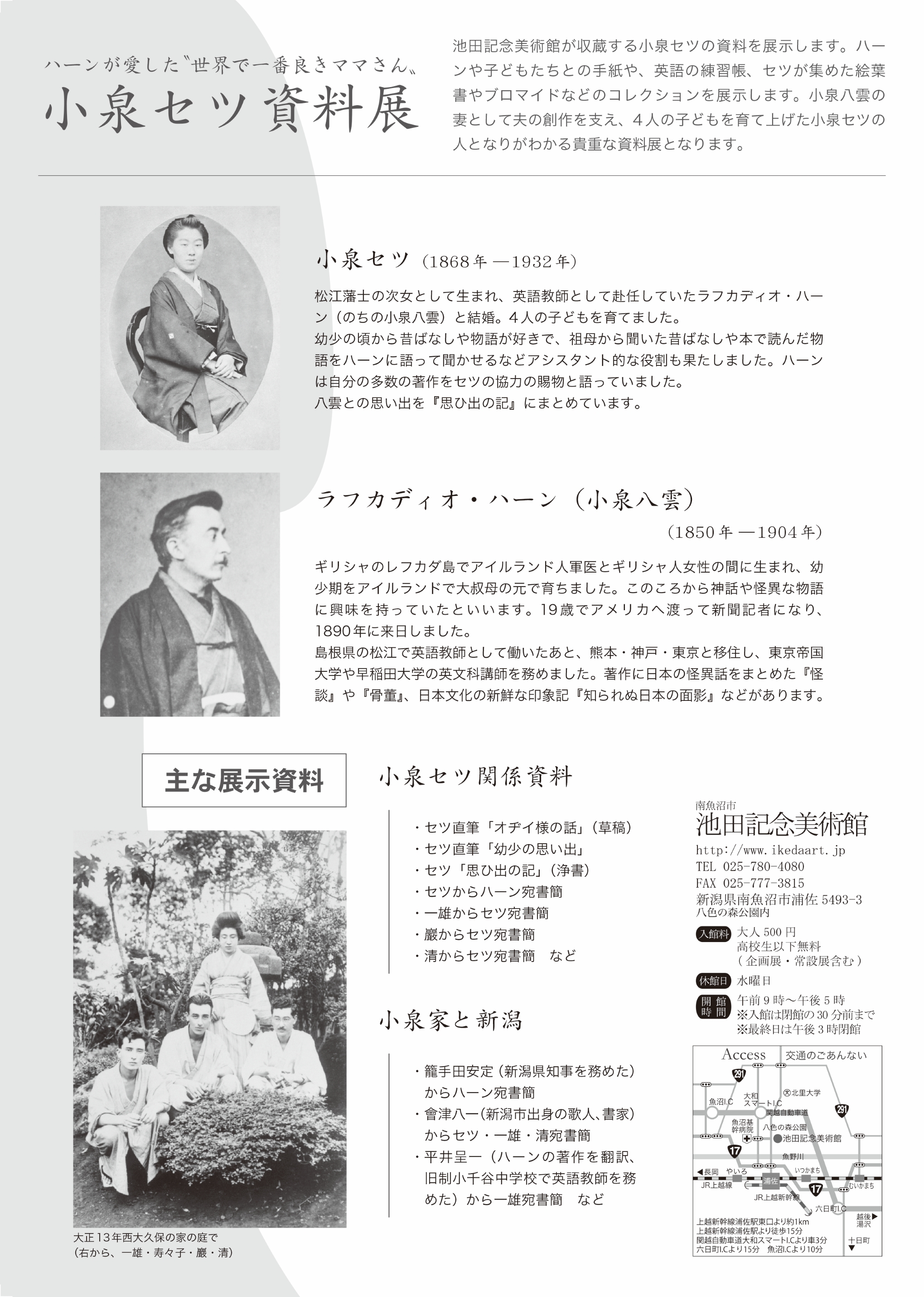 池田記念美術館が収蔵する小泉セツの資料を展示します。ハーンや子どもたちとの手紙や、英語の練習帳、セツが集めた絵葉書やブロマイドなどのコレクションを展示します。小泉八雲の妻として夫の創作を支え、4人の子どもを育て上げた小泉セツの人となりがわかる貴重な資料展となります。