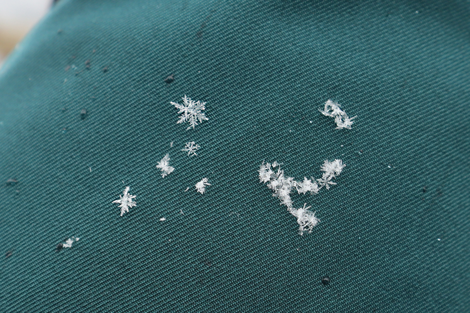 美術館周りの雪かき中にふと腕を見ると、雪の結晶を発見!