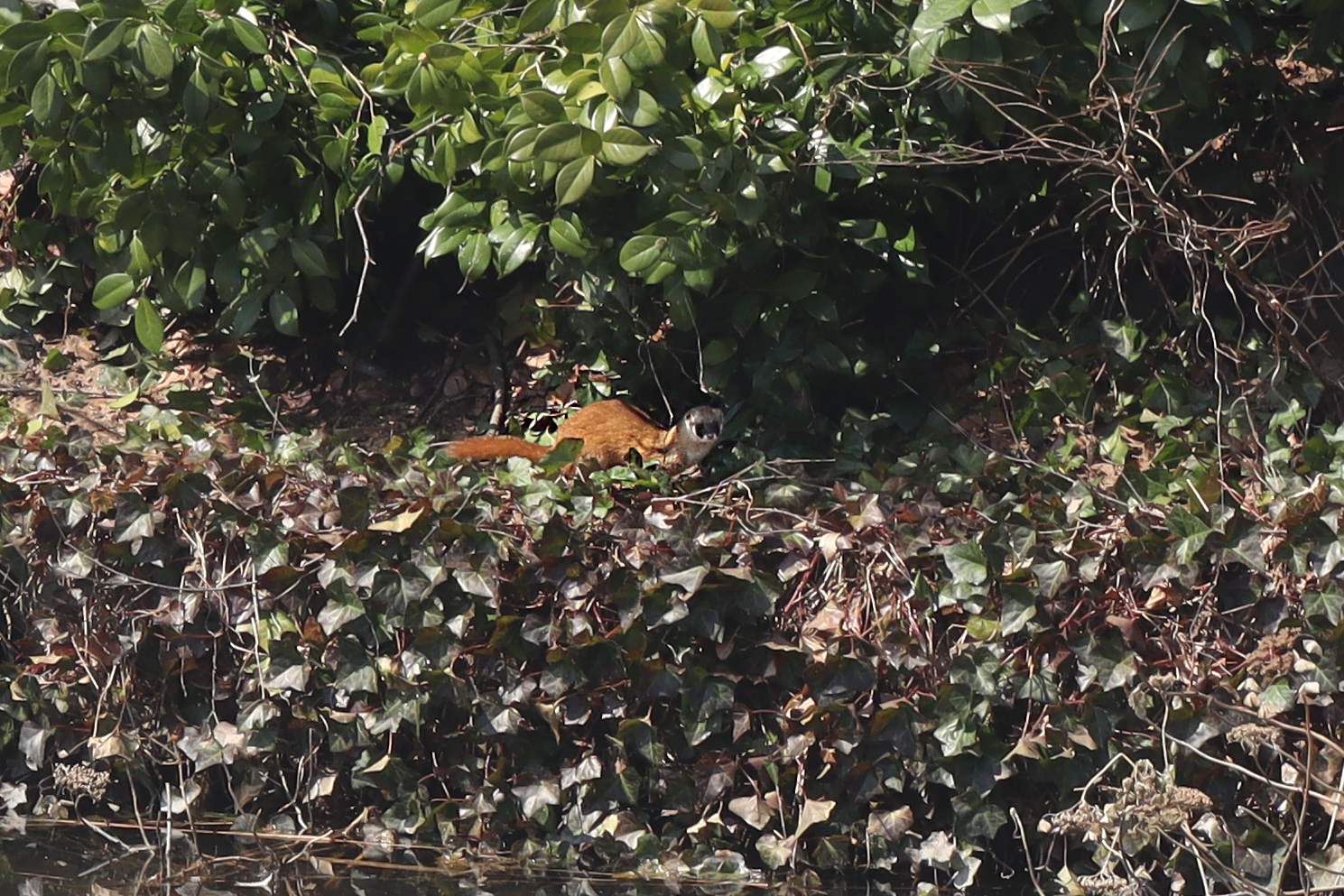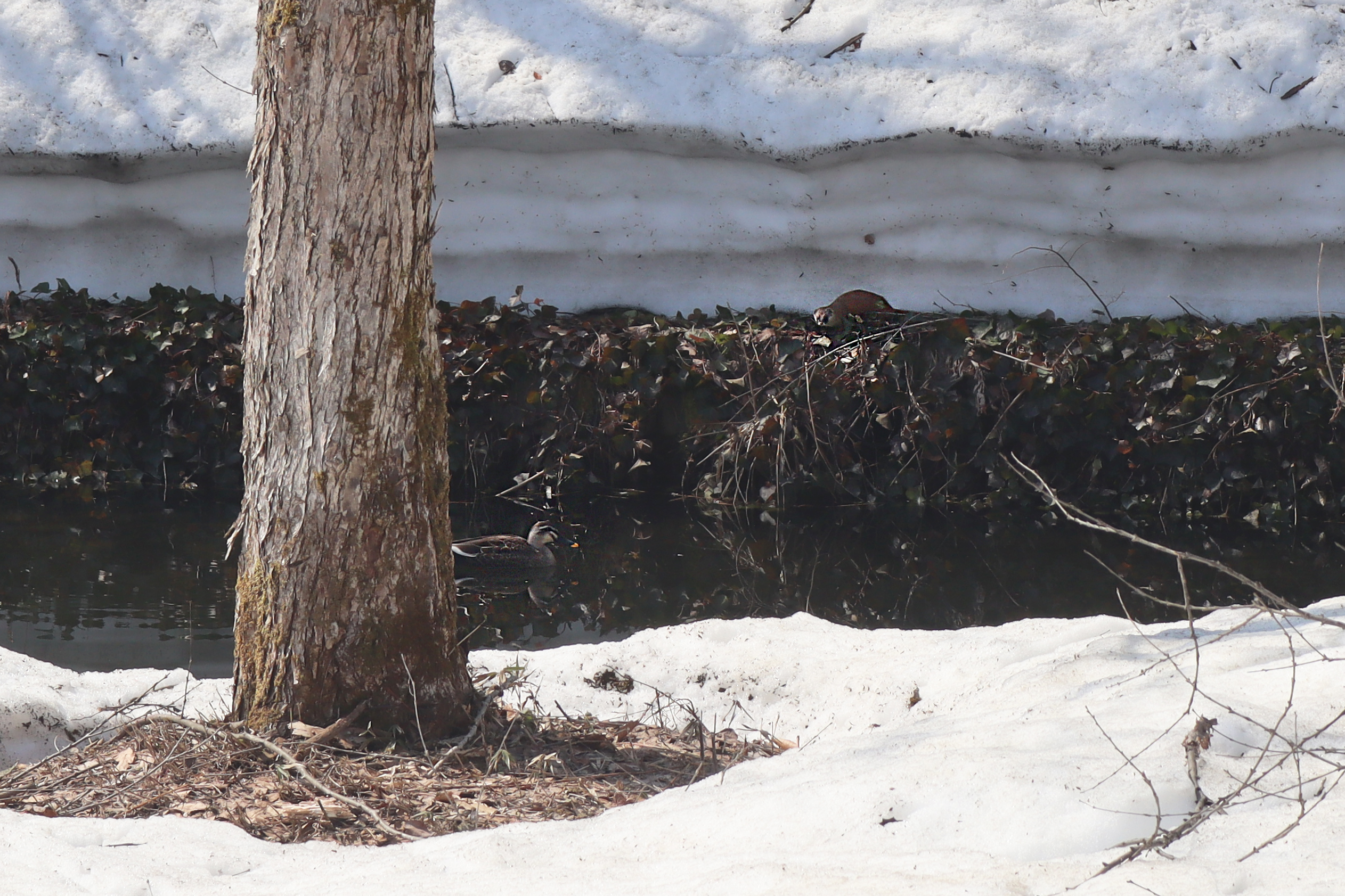 美術館の裏にイタチが遊びにきていました。ちょうど池を漂っていた鴨に遭遇して興味津々の様子です。